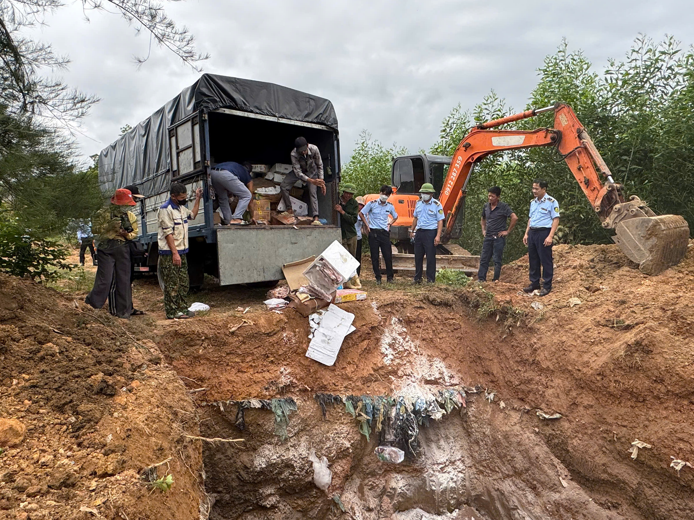 Việc tiêu hủy được thực hiện với sự tham gia giám sát của đại diện các ngành có liên quan gồm: Công an tỉnh, Sở Tài chính, Sở Nông nghiệp và Môi trường, Sở Y tế, Sở Công Thương và các Phòng chuyên môn, các Đội QLTT thuộc Chi cục QLTT tỉnh Quảng Trị.